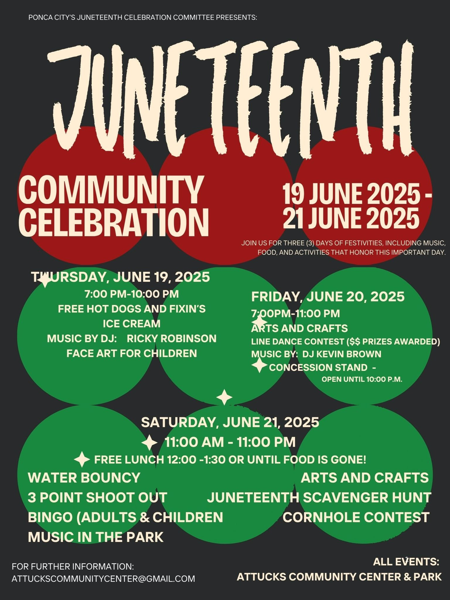 Three days. Zero excuses. Ponca City's Juneteenth celebration is back with everything from hot dogs and face paint to line dancing and cornhole battles. Thursday kicks off with free food, DJ Ricky Robinson, and kid-friendly fun. Friday cranks up the music with a line dance contest (cash prizes = more motivation) and DJ Kevin Brown spinning beats till the snack stand shuts down. Saturday is an all-day bash with bounce houses, bingo, scavenger hunts, and that sweet summertime combo: free lunch and music in the park.